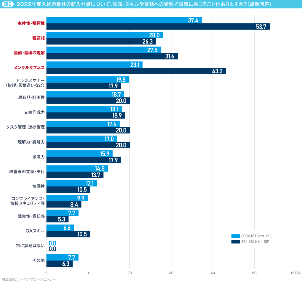 一方、301名以上では「メンタルタフネス」が43.2%、「目的・目標の理解」が31.6%と続きました。特に「メンタルタフネス」は300名以下より20.1ポイントも高い結果となりました。(図2)