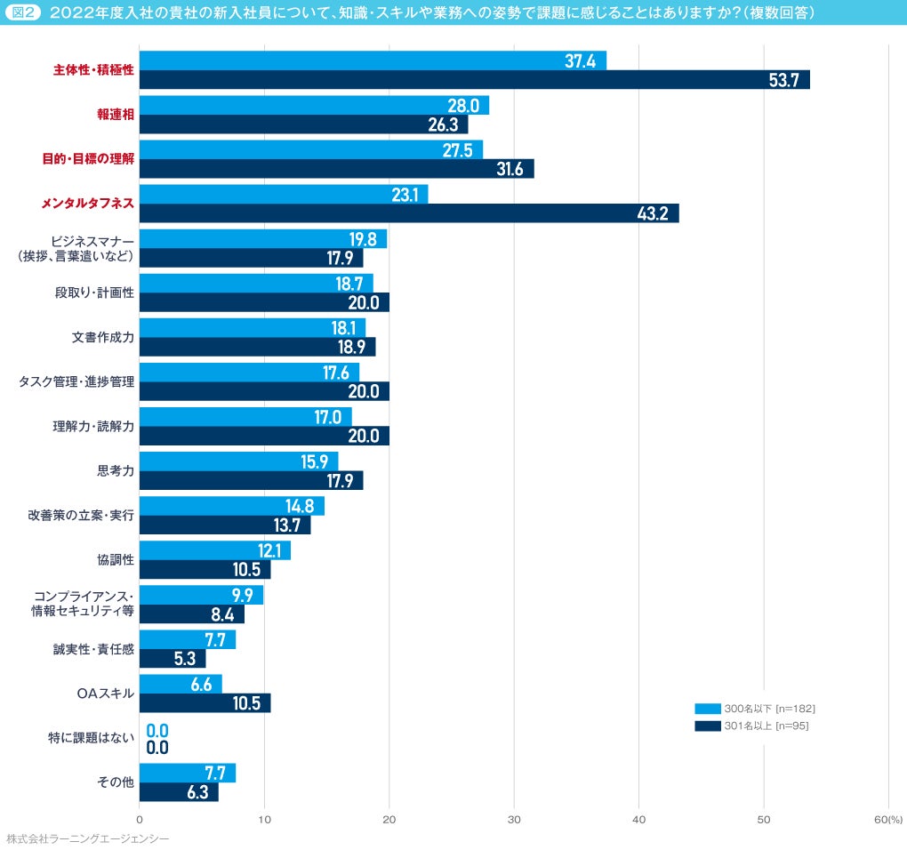 2.人事が感じる新入社員の課題、トップは「主体性・積極性」。301名以上の企業では300名以下に比べ「メンタルタフネス」が20ポイント高く2位