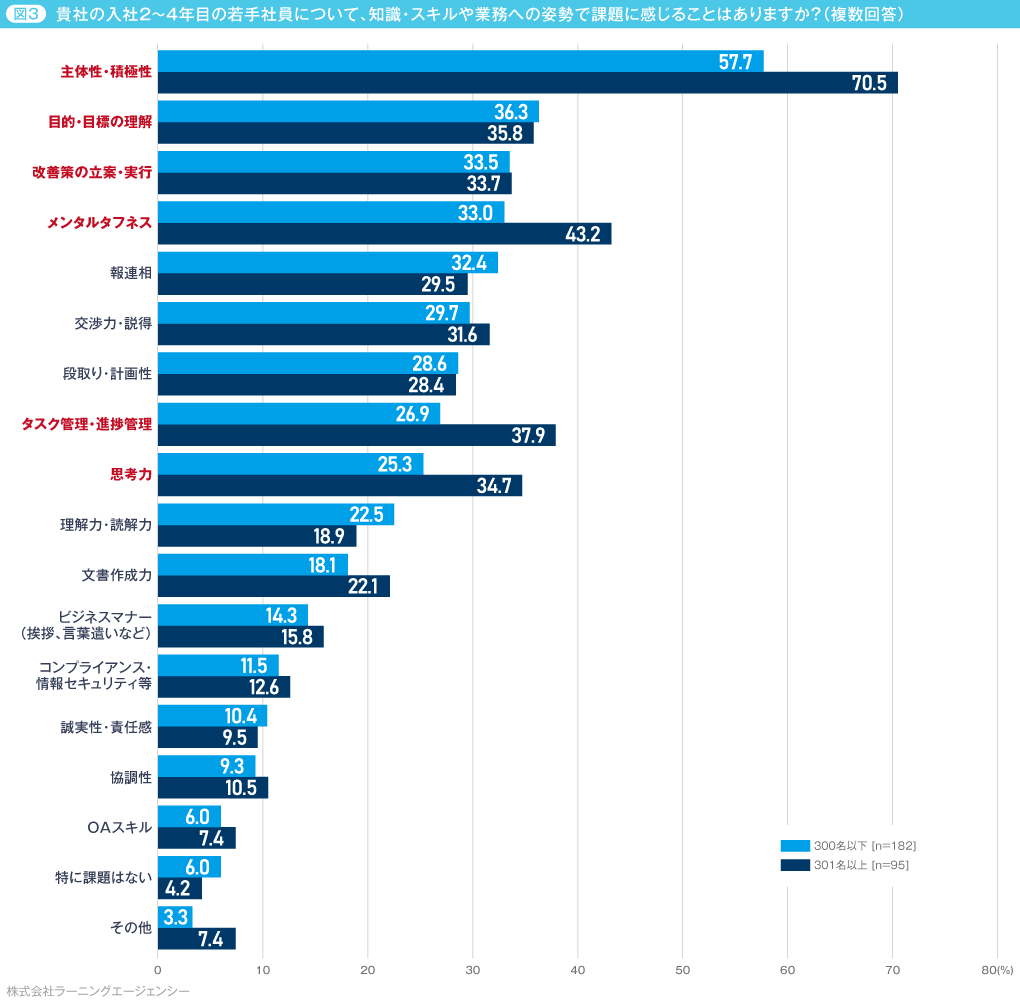結果、最も高い課題は「主体性・積極性」であることがわかりました。300名以下・301名以上、どちらも最高値であったものの、301名以上では53.7%と300名以下よりも16.3ポイントも高くなりました。