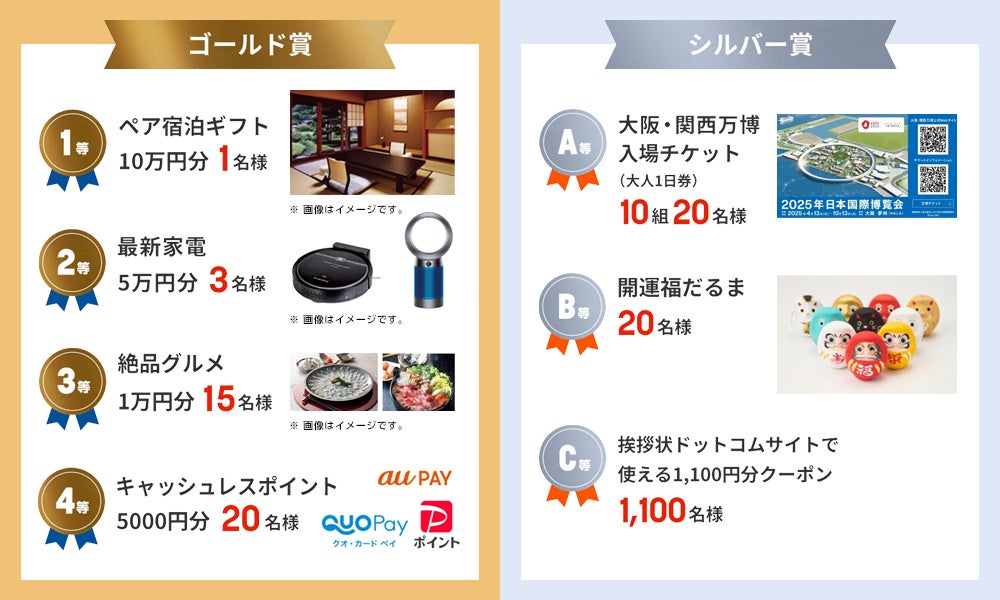 ゴールド賞の「10万円分のペア宿泊ギフト(1名様)」や、シルバー賞の「大阪・関西万博 入場チケット(10組20名様)」などの豪華賞品が抽選で当たります。
