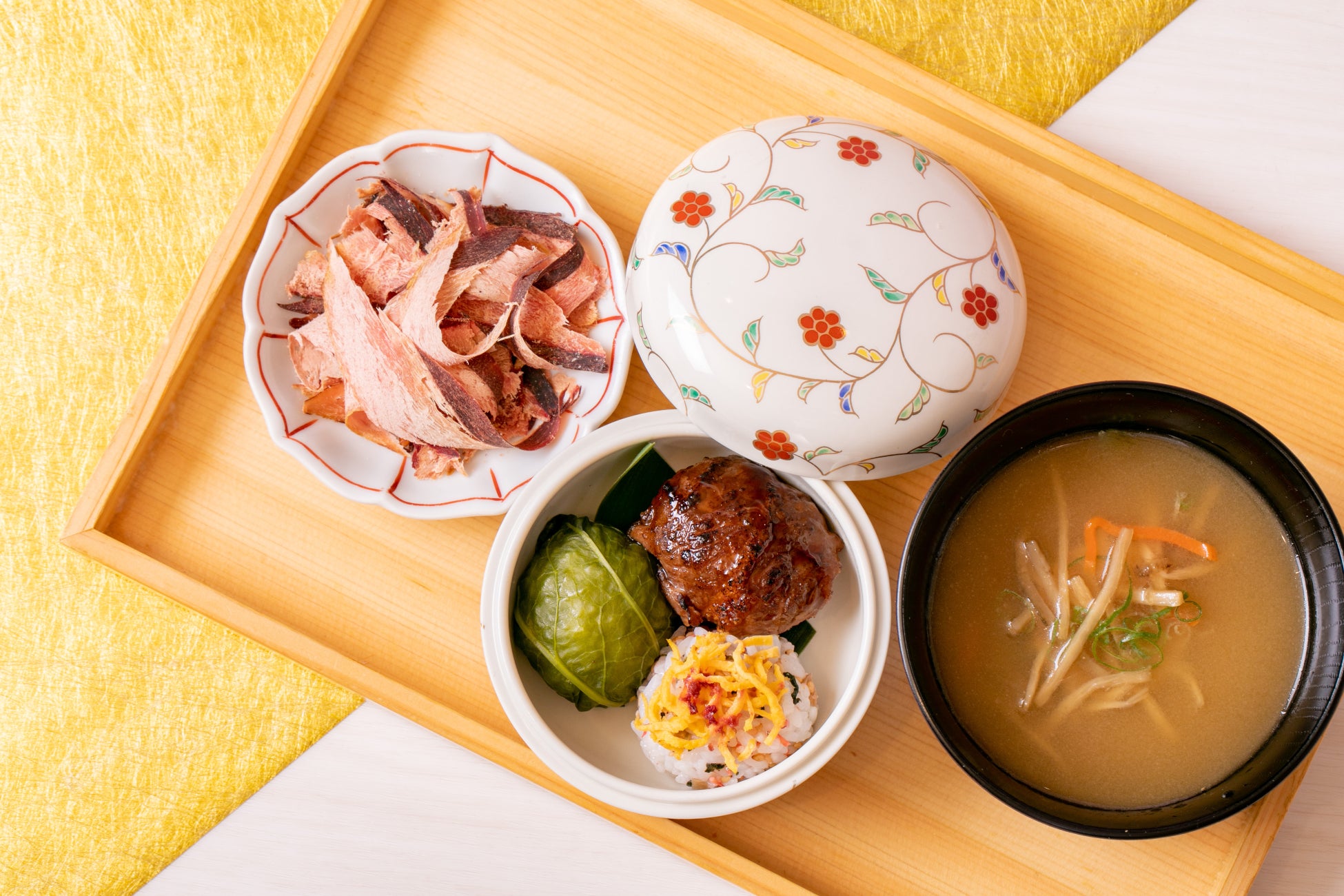 生ハムのような食感で通常の鰹節では味わえない深みのある味が好評の鰹節生節と、視覚的にも楽しめる手毬箱から3種(和牛の肉巻きおにぎり、じゃことカリカリ梅の手毬寿司、鯛のめはりおにぎり)をご用意しました。