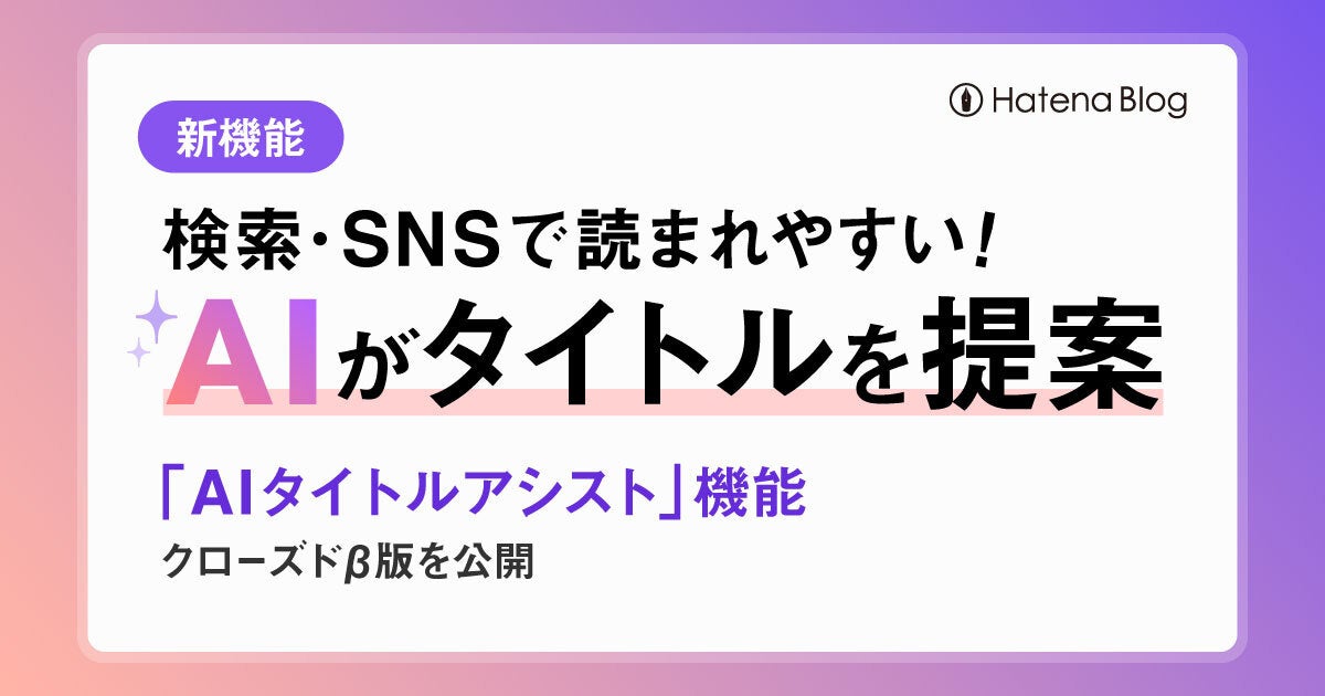 株式会社はてな(代表取締役社長:栗栖義臣/本社所在地:京都市中京区)は、ブログサービス「はてなブログ」の新機能「AIタイトルアシスト(β版)」を、クローズドベータで提供開始します。