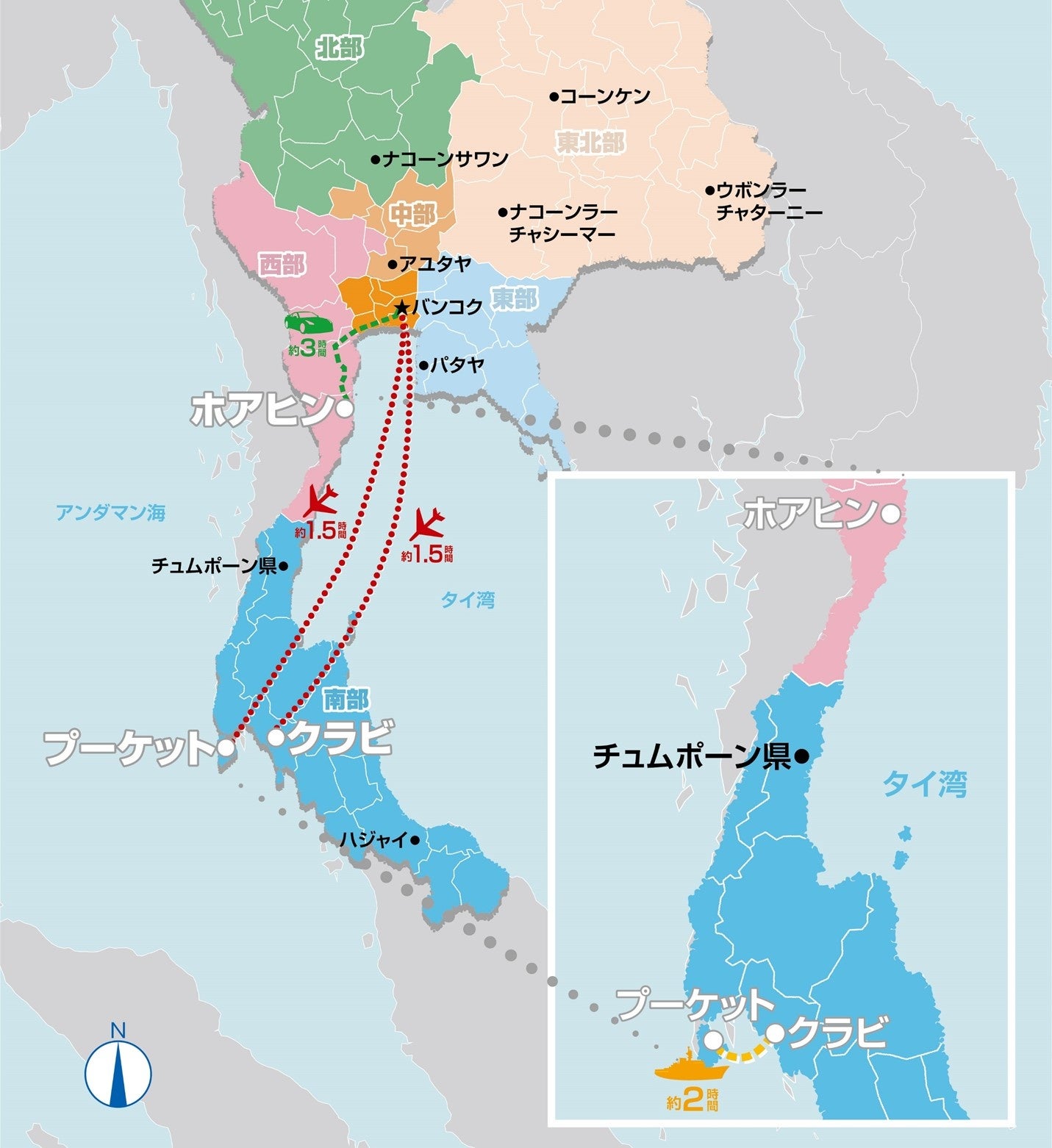 タイ南部に位置するタイ最大の島であり、世界有数のリゾート地として知られるエリアです。ビーチリゾートやマリンスポーツのほか、エンターテイメントやショッピングなどが楽しめる施設が充実しており、多数の外国人観光客が訪れるエリアとなります。