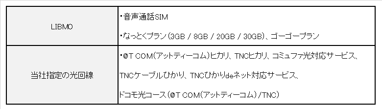LIBMOと当社指定の光回線をセットでご利用の場合、LIBMO回線1契約あたり200円/月をLIBMOの利用料金から割引いたします。LIBMO回線5契約までが対象となり、最大1,000円/月が割引となります。LIBMO×光セット割の適用には下記の条件がございます。