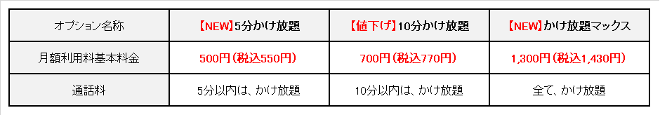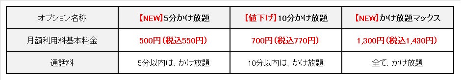 「かけ放題オプション」では、お客様のニーズにより細やかに対応するため、「5分かけ放題」を追加、「かけ放題ダブル」を見直し「かけ放題マックス」とし、通話時間が短い方から長い方まで、国内通話を定額でご利用いただけます。また「10分かけ放題」についても月額基本料金の値下げを行います。