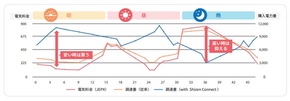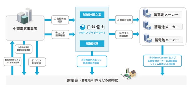 昨今、電力需給のひっ迫および市場価格の高騰は小売電気事業者にとっての大きな課題となっています。本サービスでは、自然電力のエネルギーマネジメントシステム「Shizen Connect」(*4)を活用し、蓄電池メーカーの遠隔制御システム等と連携して家庭用蓄電池をクラウド経由で遠隔制御することで、調整力を創出し、小売電気事業者の電力調達コスト削減に寄与します(図1)。