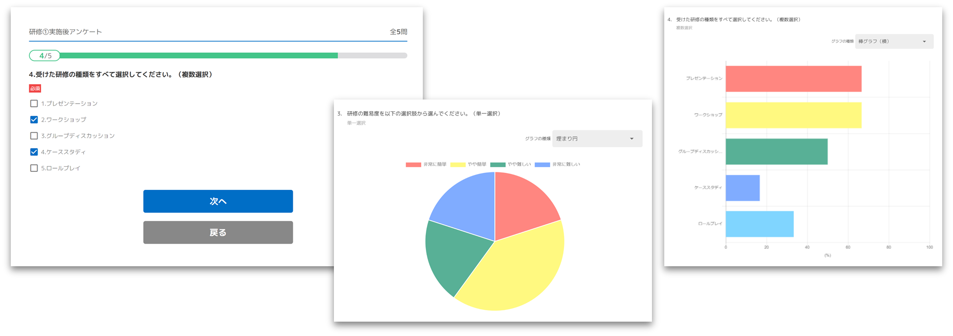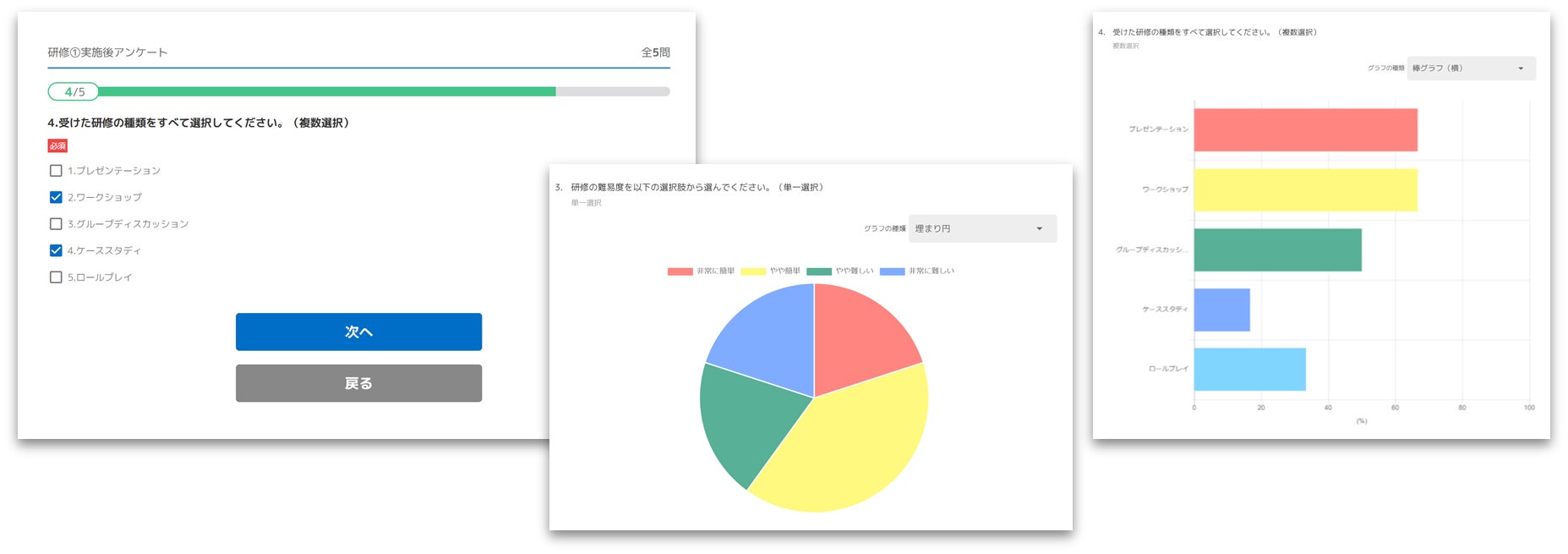 質問内容や形式を自由にカスタマイズし、目的に応じたアンケートを作成することができます。選択式や自由記述式など、多様な形式で質問が作成できます。