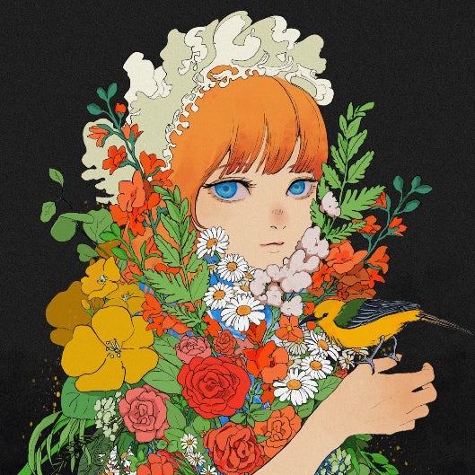 気候変動による難民問題というのは、日本で生活している私達にはあまり馴染みがないかもしれません。しかし現在、地球では今この瞬間も故郷を追われる人々がいます。人間も、動物も、植物も。少女の青い瞳は地球をイメージしています。地球は美しい星であり、沢山の生命力が溢れている事を忘れないでほしい。そんなメッセージをこの絵に込めました。