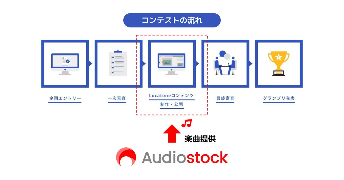 当社は当プロジェクトにおいて、一次審査を通過したファイナリストがLocatoneコンテンツを制作する際に、ストックミュージックサービス「Audiostock」で販売中の楽曲を提供いたします。