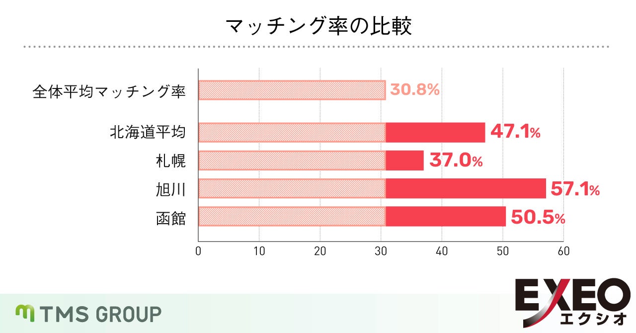TMSグループが運営する婚活パーティー「エクシオ(https://www.exeo-japan.co.jp/)」の都道府県別のマッチング率を計測したところ、全国平均が30.8%なのに対し、北海道は47.1%と全国平均に比べて約1.5倍のマッチング率となっており、47都道府県で最も高いマッチング率であることがわかりました。(調査期間:2023/01/01~2023/03/31)