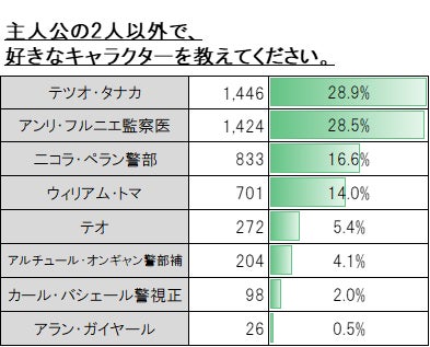 また、主人公2人を取り巻く登場人物では誰が好きか聞いたところ、アストリッドが通う日本食料品店の店主の甥「テツオ・タナカ」が第1位に、そして僅差で「アンリ・フルニエ監察医」が第2位という結果になりました。「テツオ・タナカ」はシーズン2から登場し、アストリッドの良き理解者として互いに好意を寄せあう関係の人物です。今後の2人の恋の行方が気になるという声が多数ありました。第2位の「アンリ・フルニエ監察医」は、“アストリッドの知識の豊富さにはじめは邪険にしていたものの、徐々にアストリッドを認め尊敬しあう関係性がよい”といったご意見が多く、素直でお茶目なところも、ドラマの中での癒し的存在として人気のようです。