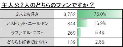 主人公2人のどちらのファンか聞いたところ、「2人とも好き」が75%で圧倒的な結果に。主な理由は“お互いの長所や短所を理解して、前に進んでいく関係性が好き”というコメントが多く見受けられました。