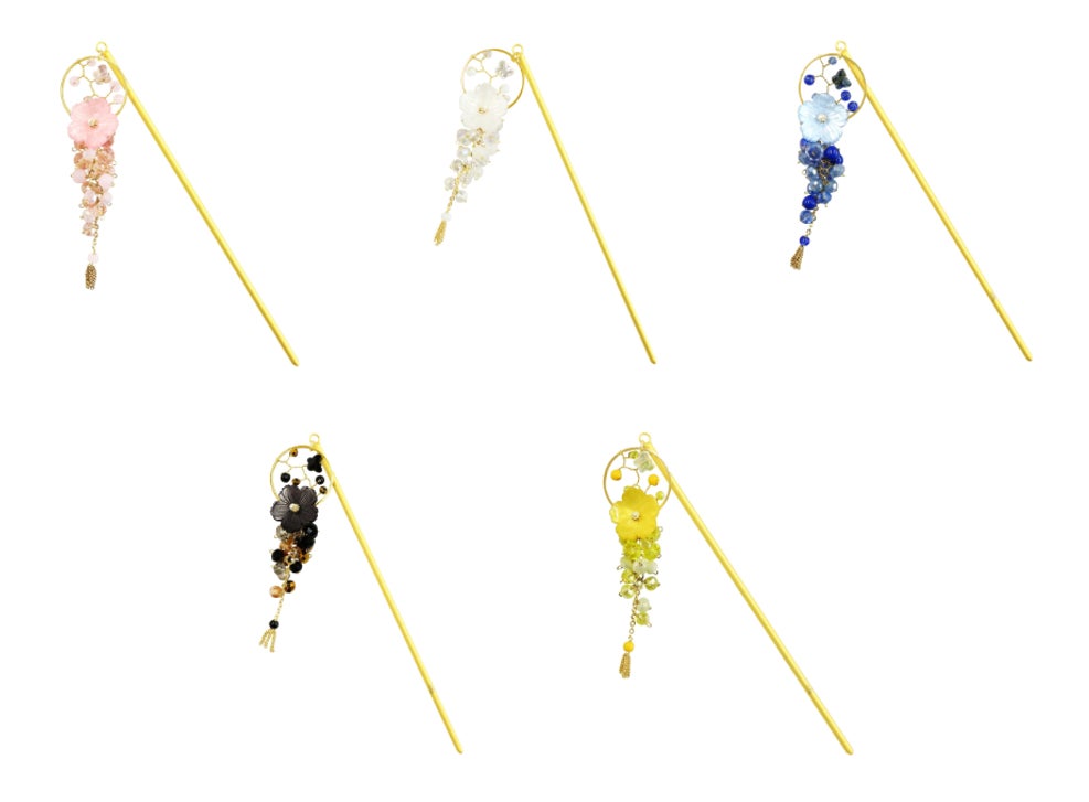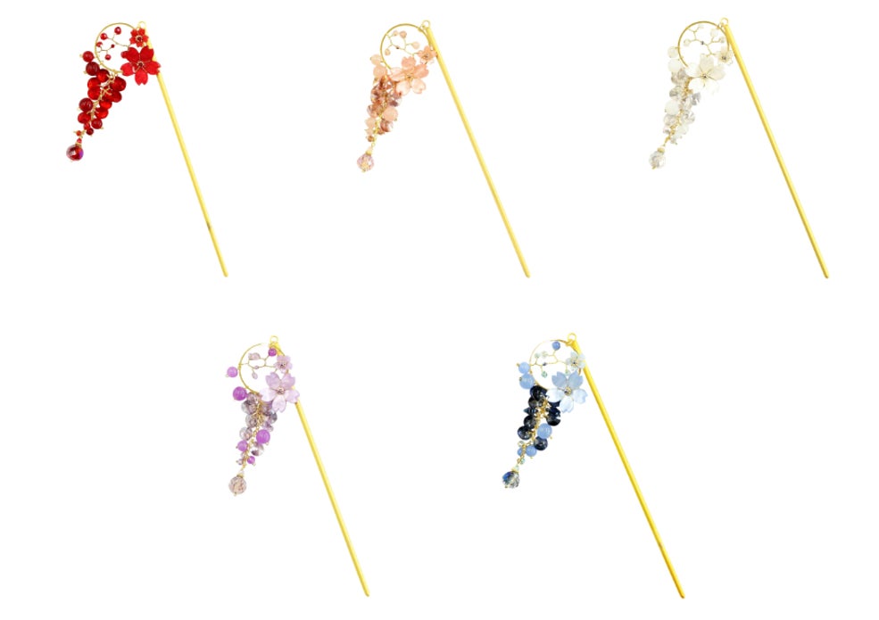 「零桜一本簪」は、桜の優美な姿をモチーフに、繊細なガラスビーズを贅沢に配した逸品です。咲き誇る桜の花びらが風に舞うような立体的なデザインは、髪を彩る瞬間から特別な存在感を放ちます。光を受けて煌めくビーズの輝きは、まるで朝露に濡れた桜のように清らかな美しさを演出します。こちらも5色展開で、それぞれが異なる表情を持ち、装う人の個性に寄り添います。