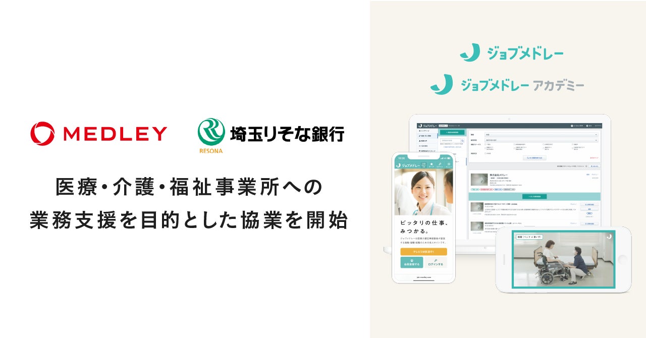株式会社メドレー(本社:東京都港区、代表取締役社長:瀧口 浩平、以下メドレー)は、医療・介護・福祉事業所が抱える人材領域における経営課題の解決を目的に、株式会社埼玉りそな銀行(本社:埼玉県さいたま市、代表取締役社長:福岡 聡、以下埼玉りそな銀行)との協業を開始しました。