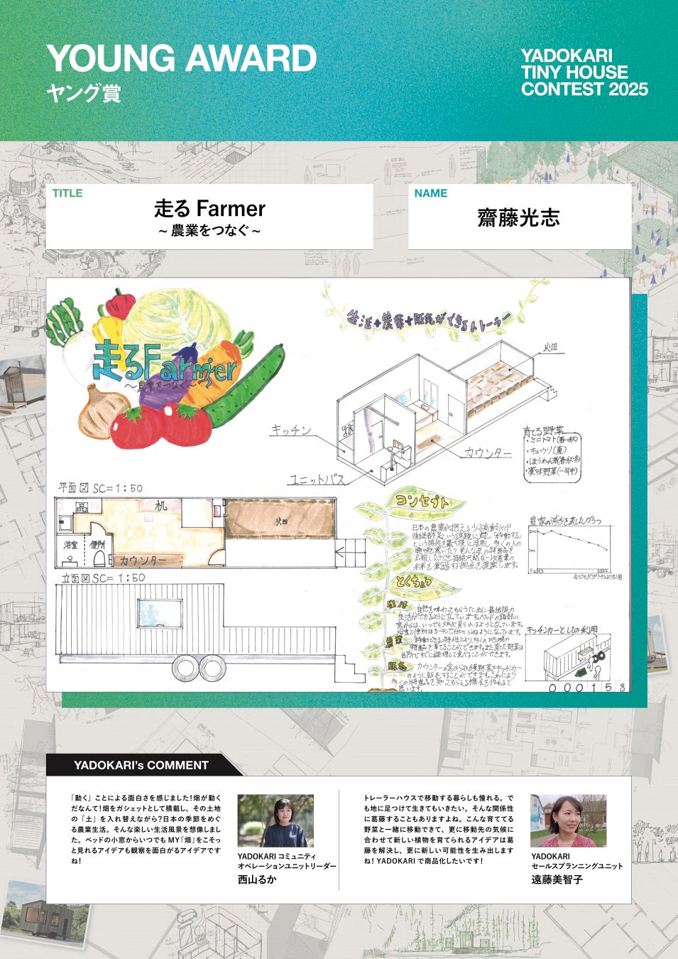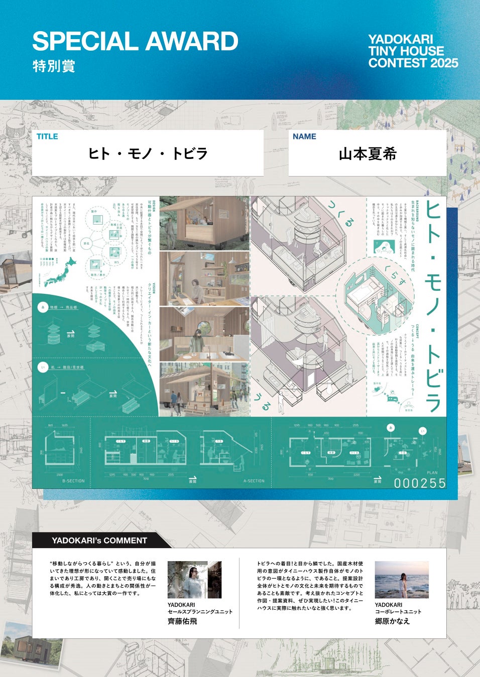 タイニーハウスを「プロダクト」としてだけでなく、「関係性を育むメディア」として捉えた提案が複数あり、住まいという枠を超え、地域に入り込む装置としての可能性を模索している姿勢に、YADOKARIとしても共鳴する部分が多く、今後の展開が楽しみです。たくさんのご応募ありがとうございました。