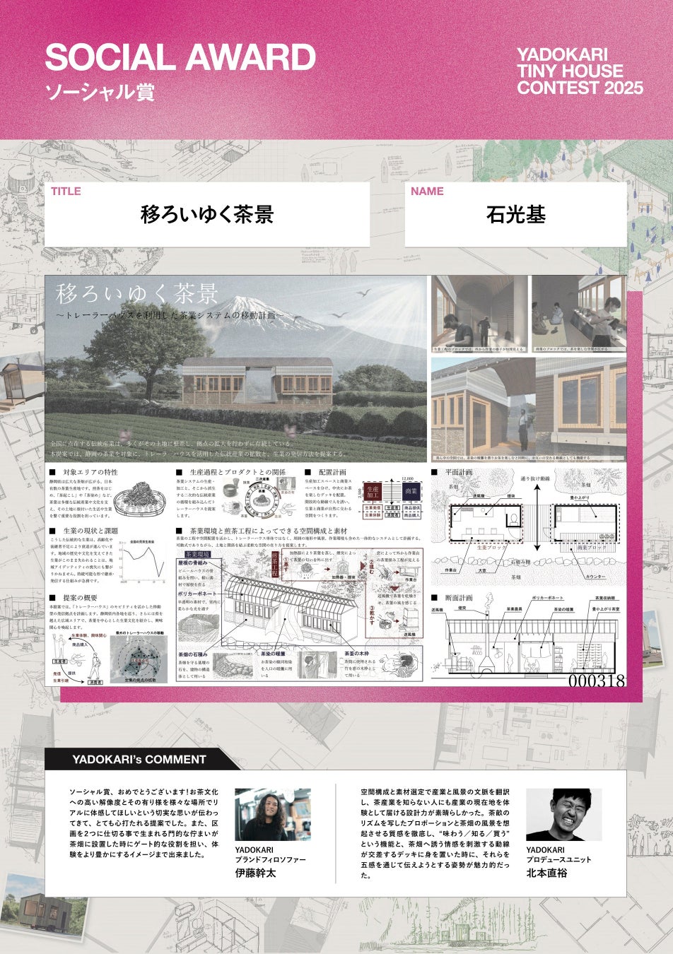 受賞者コメント:この度は栄誉ある賞を頂き、誠にありがとうございます。大変嬉しく感じております。私の提案は、トレーラーハウスの稼働性に着目し、土地に根ざした伝統産業と掛け合わせることで、「動かないものを動かす」ことをテーマにしたものです。今回は茶業を題材としましたが、他の伝統産業にも応用できる可能性があると考えています。このような機会をいただき、多くの方に提案をご覧いただけたこと、心より感謝申し上げます。