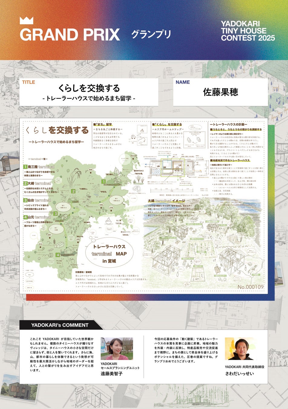 受賞者コメント:この度は賞をいただき、大変驚いております。ありがとうございます。山にも海にも近く自然豊かな宮城の魅力を伝えたいと思い、各地を巡るトレーラーハウスと仕組みを提案しました。訪れる人と迎える人、双方が豊かになれる空間とは何かを考えながら取り組みました。