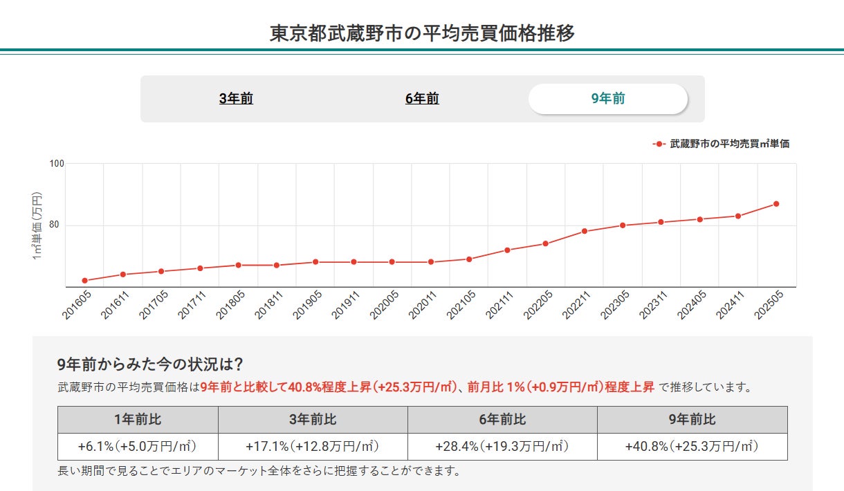 過去9年の価格推移を町名単位で振り返ると、吉祥寺エリア全体で平均約40〜60%の価格上昇が見られます。特に、上昇幅が大きかったエリアとそうでないエリアの「差」が明確になりつつあります。