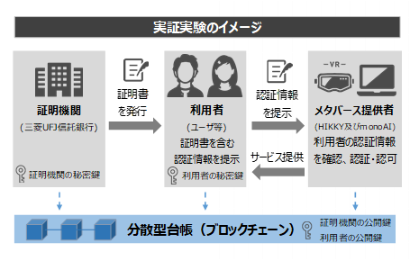 HIKKYおよびmonoAIは利用者らが提示する情報を分散型台帳で検証することで、証明書を発行した三菱UFJ信託銀行に問い合せることなく本人の真正性を確認します。