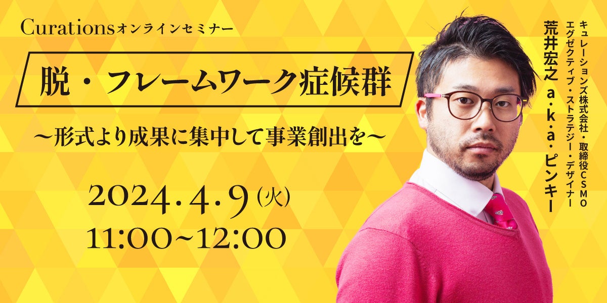 顧客企業のビジネス変革を成功に導くキュレーションズ株式会社(本社:東京都渋谷区、代表取締役社長:根本隆之、以下当社)は、『脱・フレームワーク症候群〜形式より成果に集中して事業創出を〜』を2024年4月9日(火)に開催いたします。