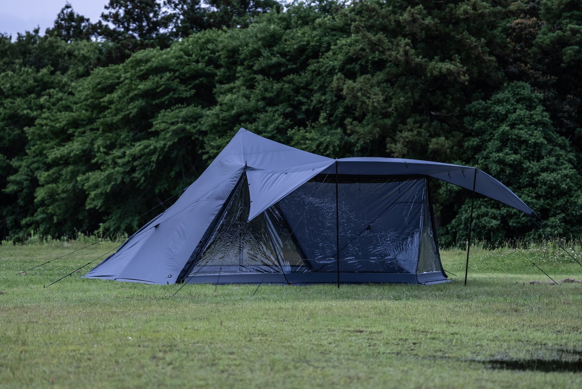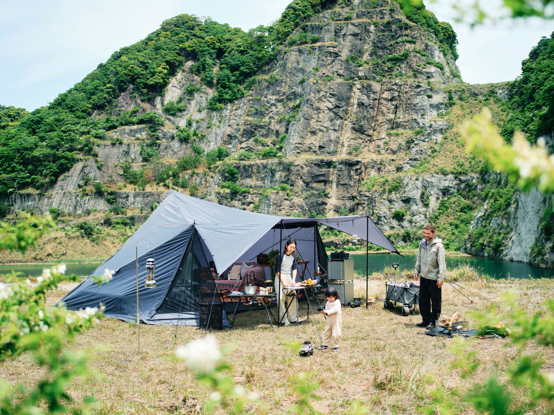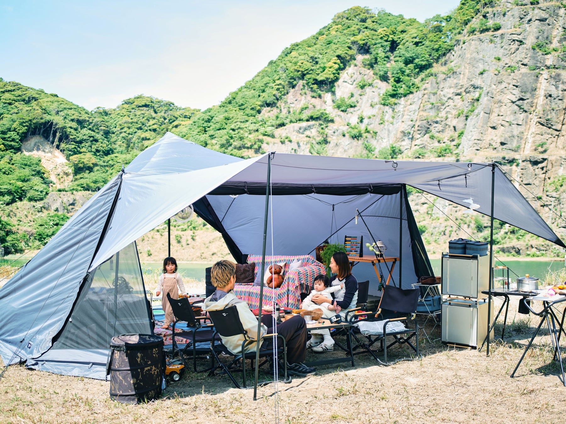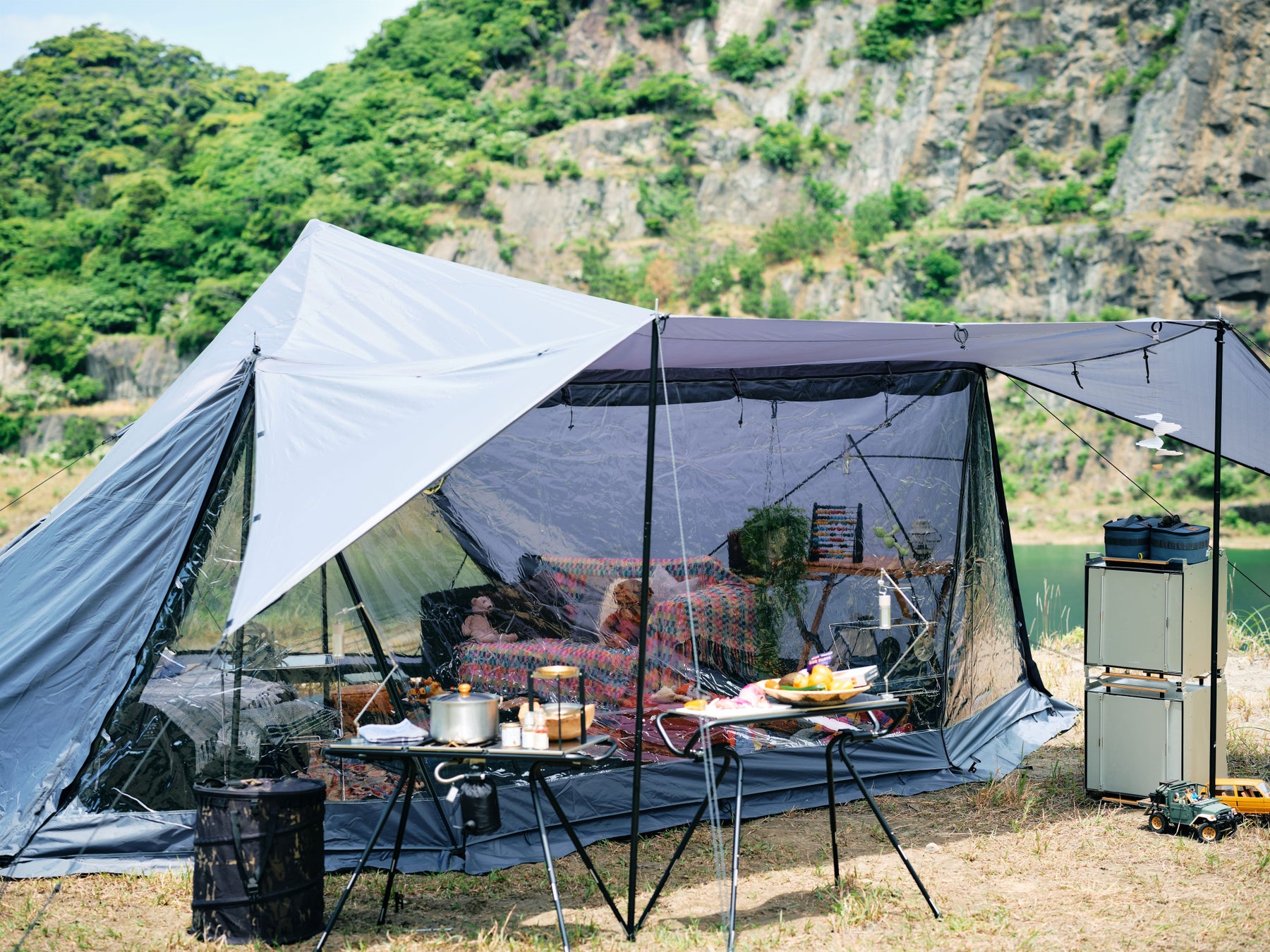フロントにはスクリーン式パネルを配置。跳ね上げ式のパネルを最大限に解放すれば雄大な景色を望むことができます。日差しや雨をしっかりと防ぎタープとしても使用が可能。メインパネルは、フルクローズ、メッシュ、フルオープンの3通りの使い方ができ、天候やシーンに合わせて快適な空間を演出。リアスクリーンを巻き上げればまるで外にいるかのような開放感と自然との一体感を味わうことができます。