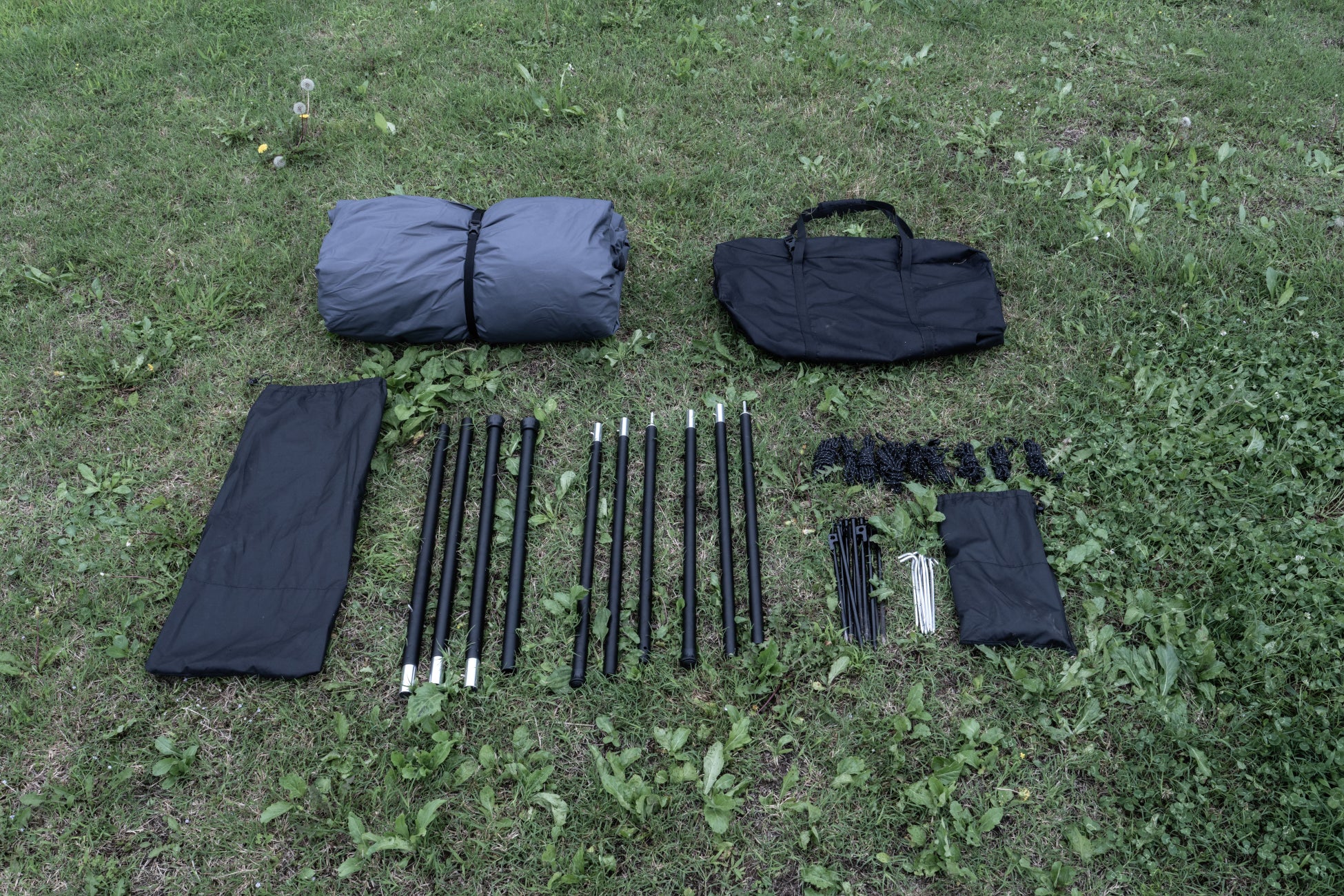 テント本体だけではなく、フレームやパーツもすべて収納ケースに入れてパッキングが可能。総重量は16.7kgと持ち運びやすさも考慮されたサイズ感。また、スクリーンパネルを展開した状態でも針紐やクルマも含めて10m×10mの区画サイト内の収まる設計です。