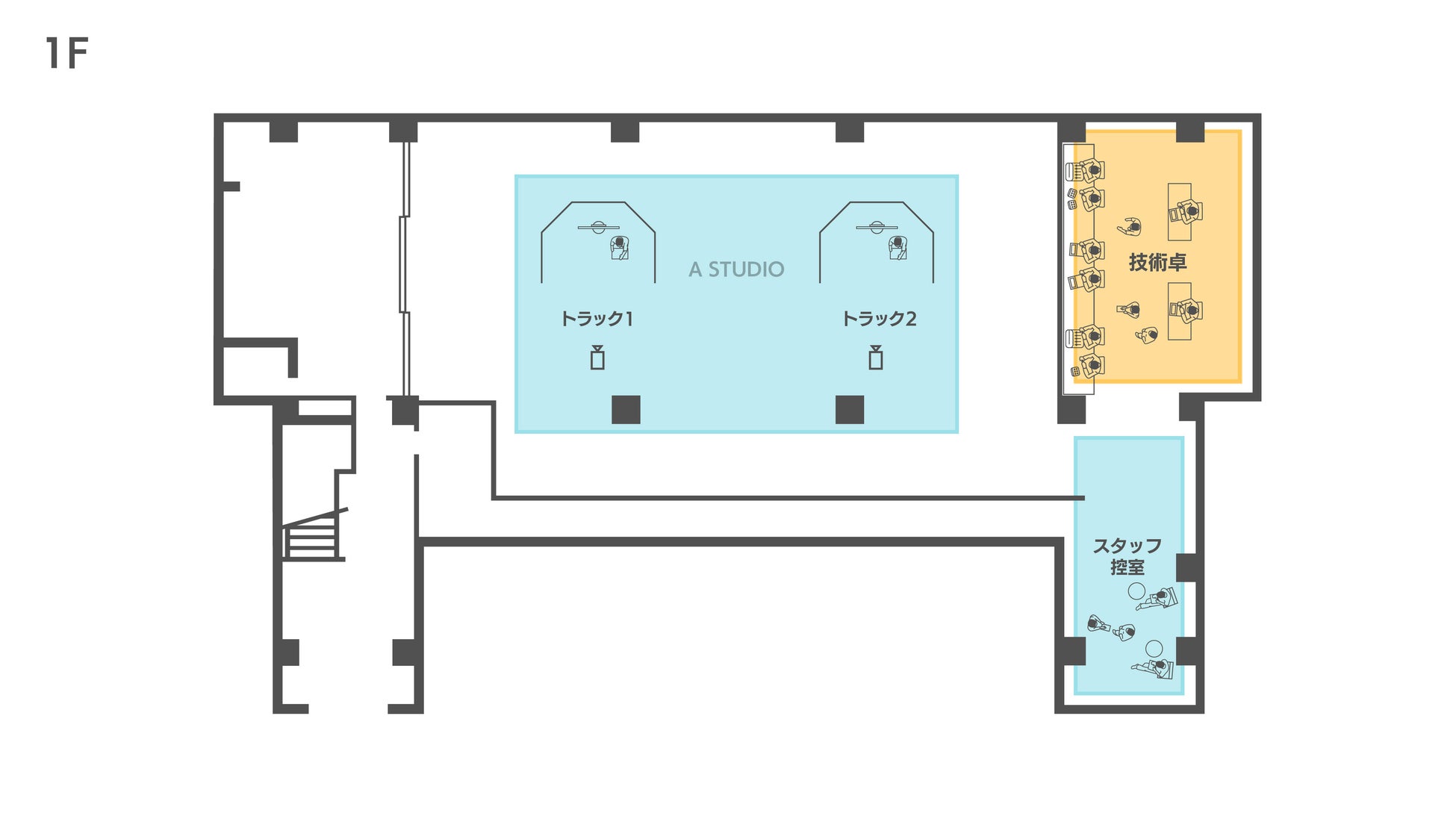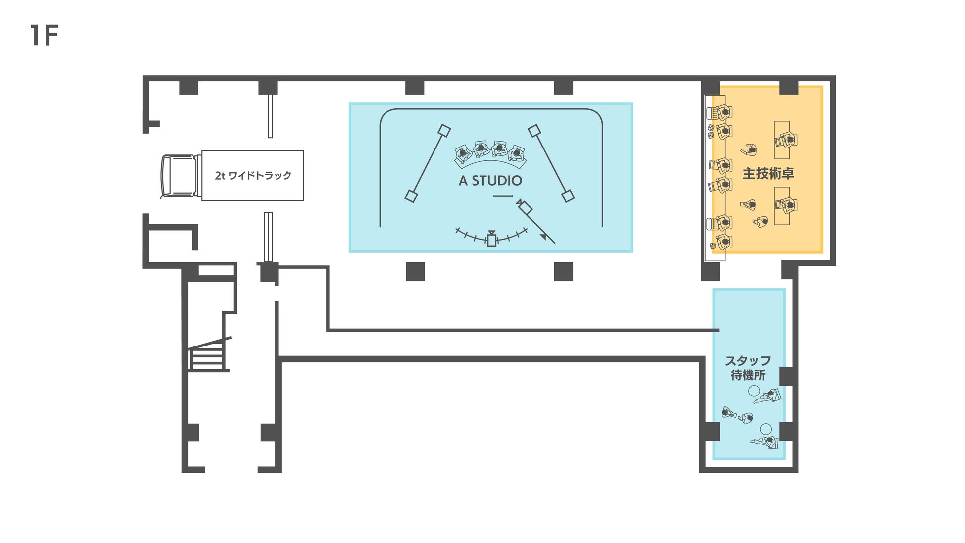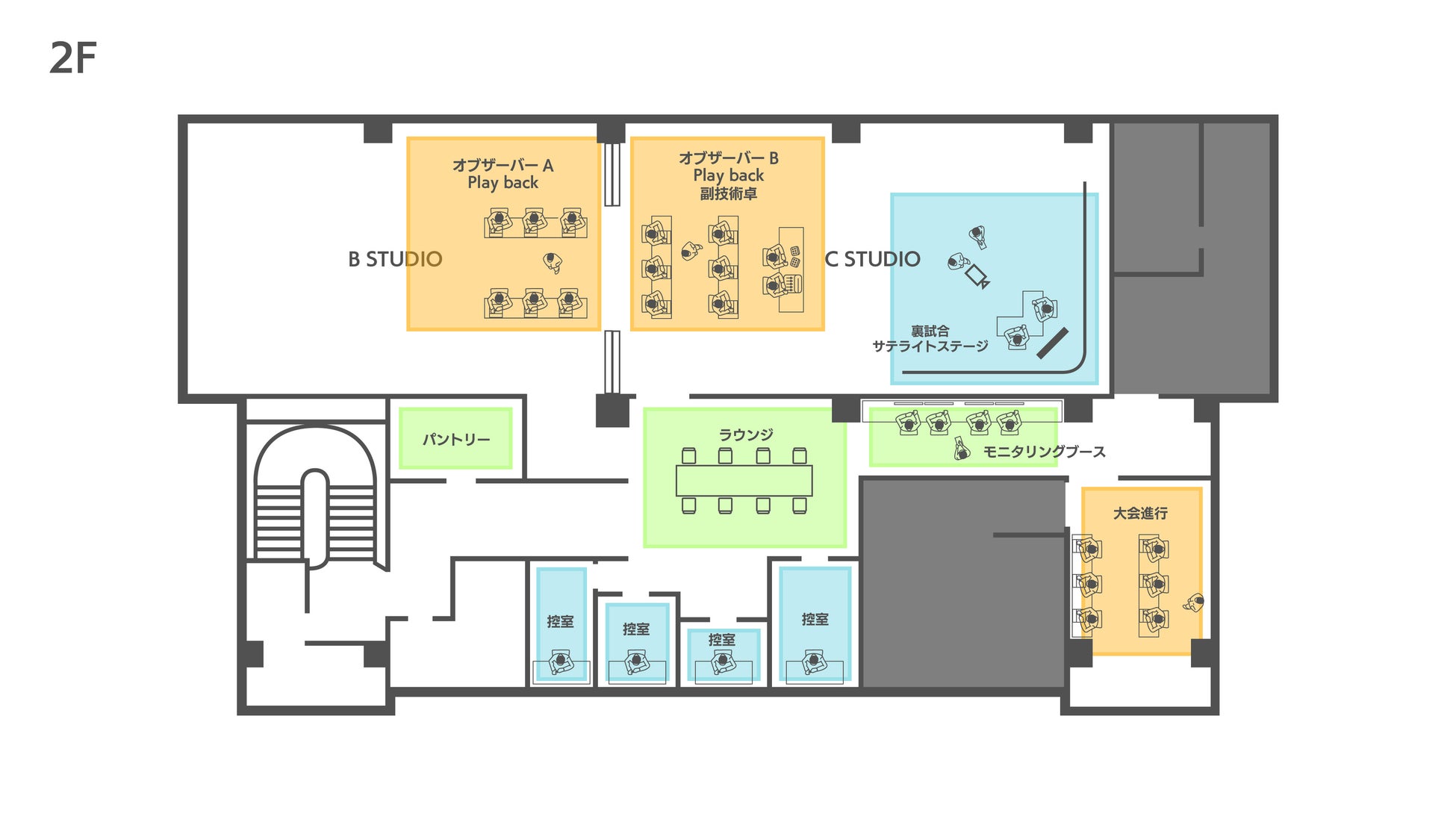 用途の異なる3つのスタジオ、4つの控室、事務局機能など多目的に活用できるオペレーションルーム、ラウンジなどを備えています。