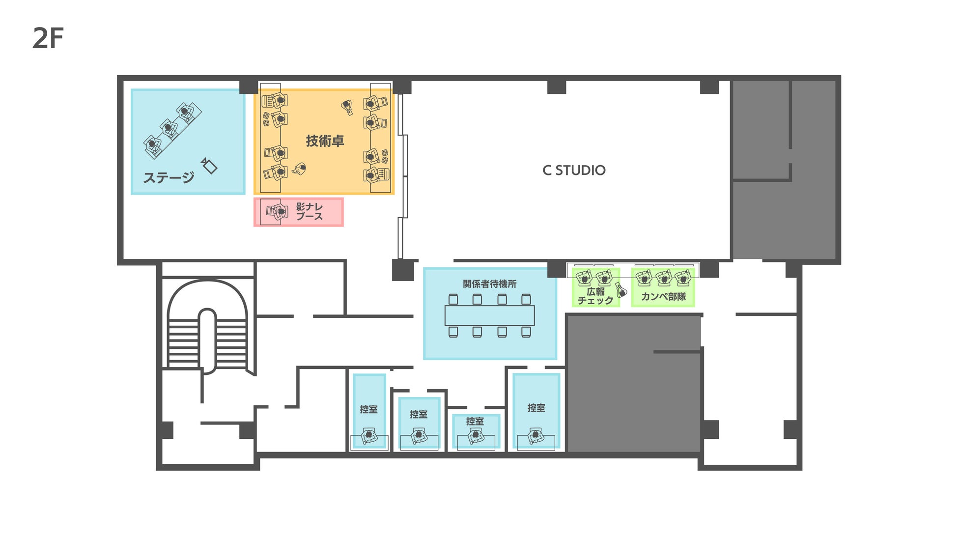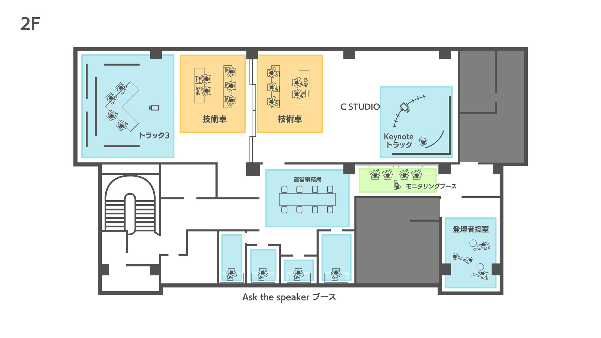 複数のセッションの制作進行と事務局機能を集約できます。控室を音声配信ブースとしても利用可能です。