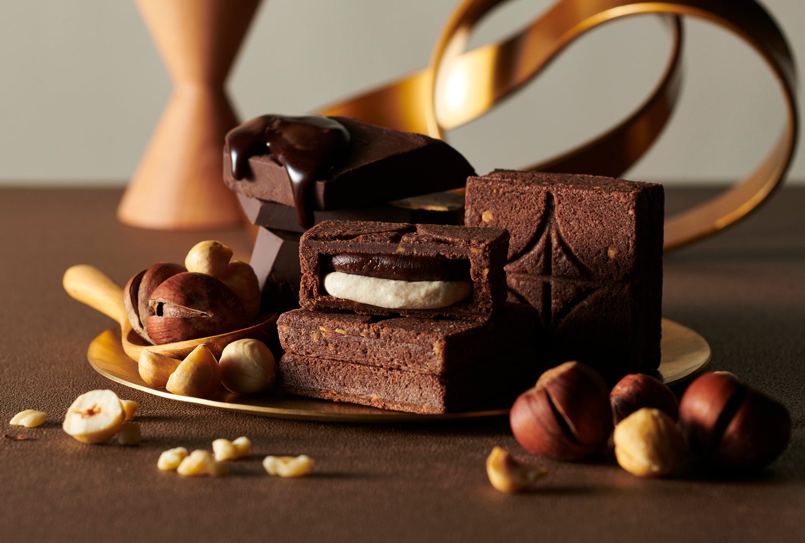 深煎りしたナッツのように香ばしく豊潤な香りのチョコレートと、ヘーゼルナッツペーストを合わせた「ヘーゼルナッツショコラキャラメル」。ローストしたヘーゼルナッツのペーストを混ぜ込んだ、香ばしく甘い「バタークリーム」。2層をサンドするクッキー生地には食感のアクセントとして、ローストしたヘーゼルナッツを刻み入れました。