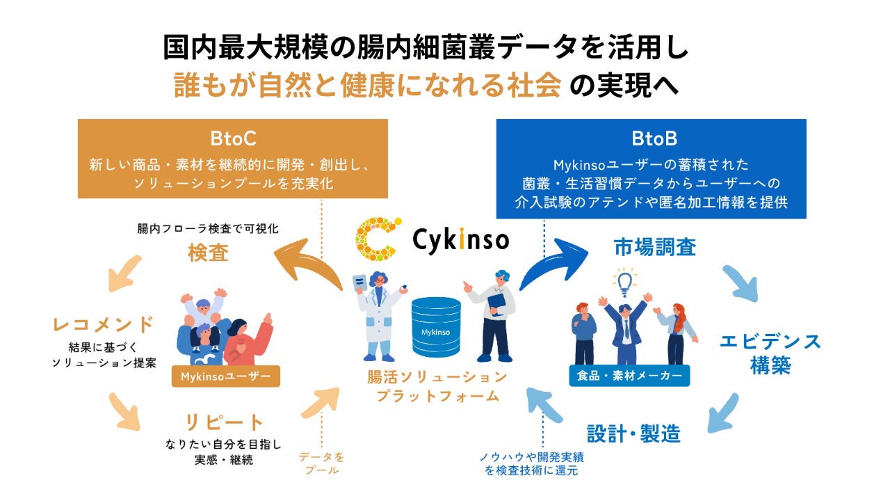 「細菌叢で人々を健康に」を企業理念に掲げ、腸内フローラをはじめとする常在細菌叢と心身の健康・疾患リスクとの関連を解明し、全ての人々の日常に個別最適な解を提供することで、誰もが自然と健康になれる社会を目指しています。その一環として、腸内環境の状態を把握することが健康維持・増進に繋がるとの考えから、自宅で手軽にできる腸内フローラ検査「マイキンソー(Mykinso)」を開発しました。日本人の大規模な菌叢データベースと高度なデータサイエンス技術を活用し、検査サービスの拡張やOEM開発、システム構築支援、匿名加工情報の研究利活用推進など、菌叢データに基づく事業を多角的に展開しています。
