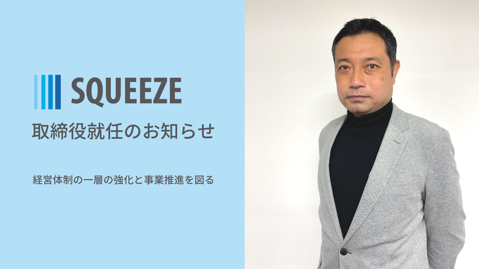 株式会社SQUEEZE (本社:東京都港区、代表取締役:舘林 真一、以下、「当社」) は、取締役CBO(Chief Business Officer:最高業務責任者)に丸野 卓也が就任したことをお知らせいたします。