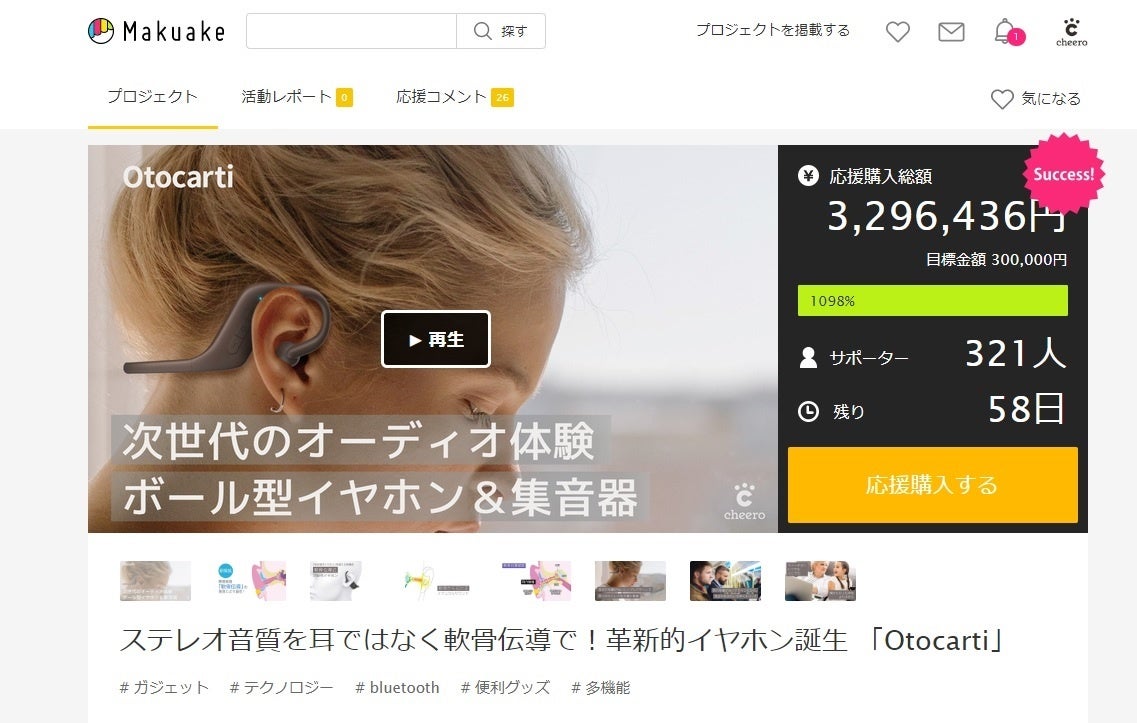 Makuakeにて早くも目標金額1000%達成!! 骨伝導を超えた!? 軟骨伝導イヤホン「cheero Otocarti(オトカルティ)」