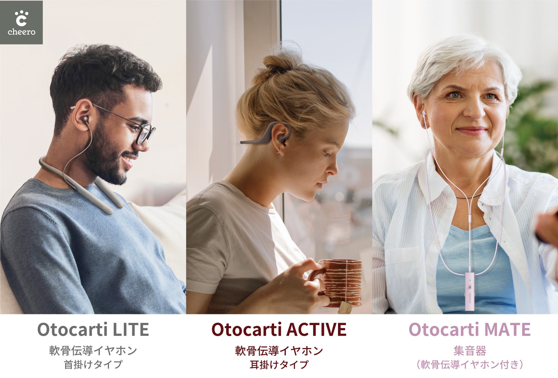 装着していることを忘れるほどの着け心地。まるで耳元にスピーカーがあるような臨場感。開放感たっぷりで快適性にも優れている「Otocarti」は、まったく新しい軟骨伝導という第3の聴覚で、声・音楽を聴くことができる新