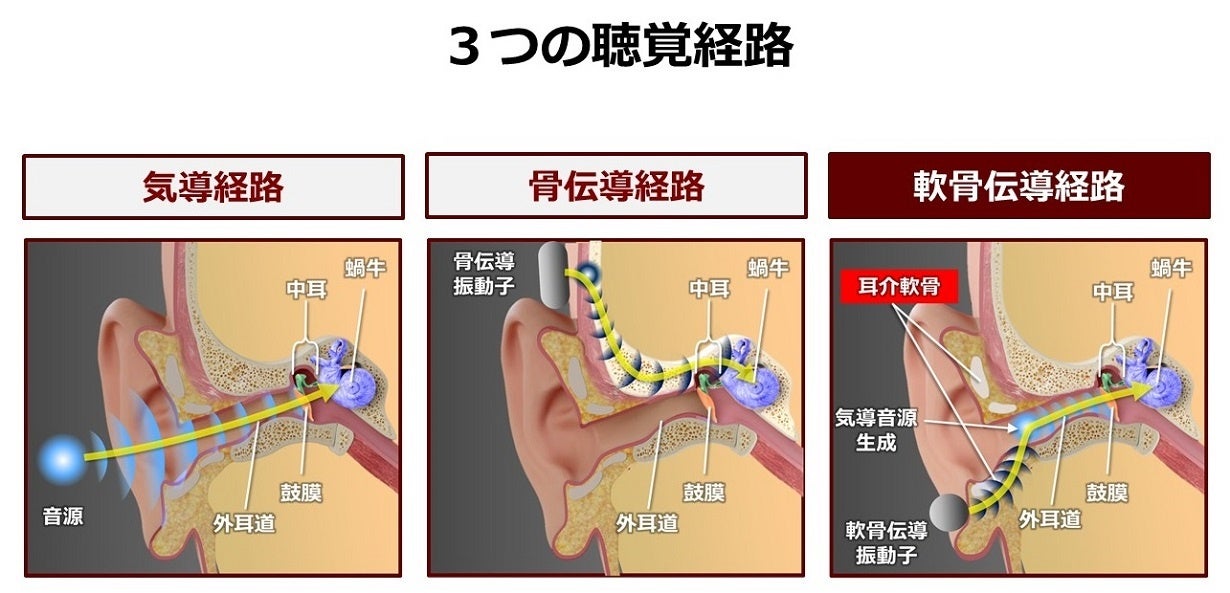 「軟骨伝導」は「骨伝導」の一種であるかのように誤解されがちですが、その聞こえのメカニズムや音伝達の性質、特徴は「骨伝導」とは全く異なります。2004年に奈良県立医科大学 理事長・学長の細井裕司先生が発見した軟骨伝導は、これまでに知れ渡っていた空気を震わせて音を伝える「気導」と、骨を震わせて音を伝える「骨導」とは別の経路となる第3の聴覚です。