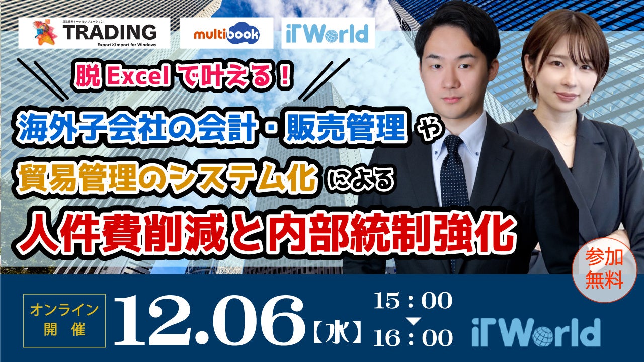 【12/6(水)無料Webセミナー】脱Excelで叶える!海外子会社の会計・販売管理や貿易管理のシステム化による人件費削減と内部統制強化