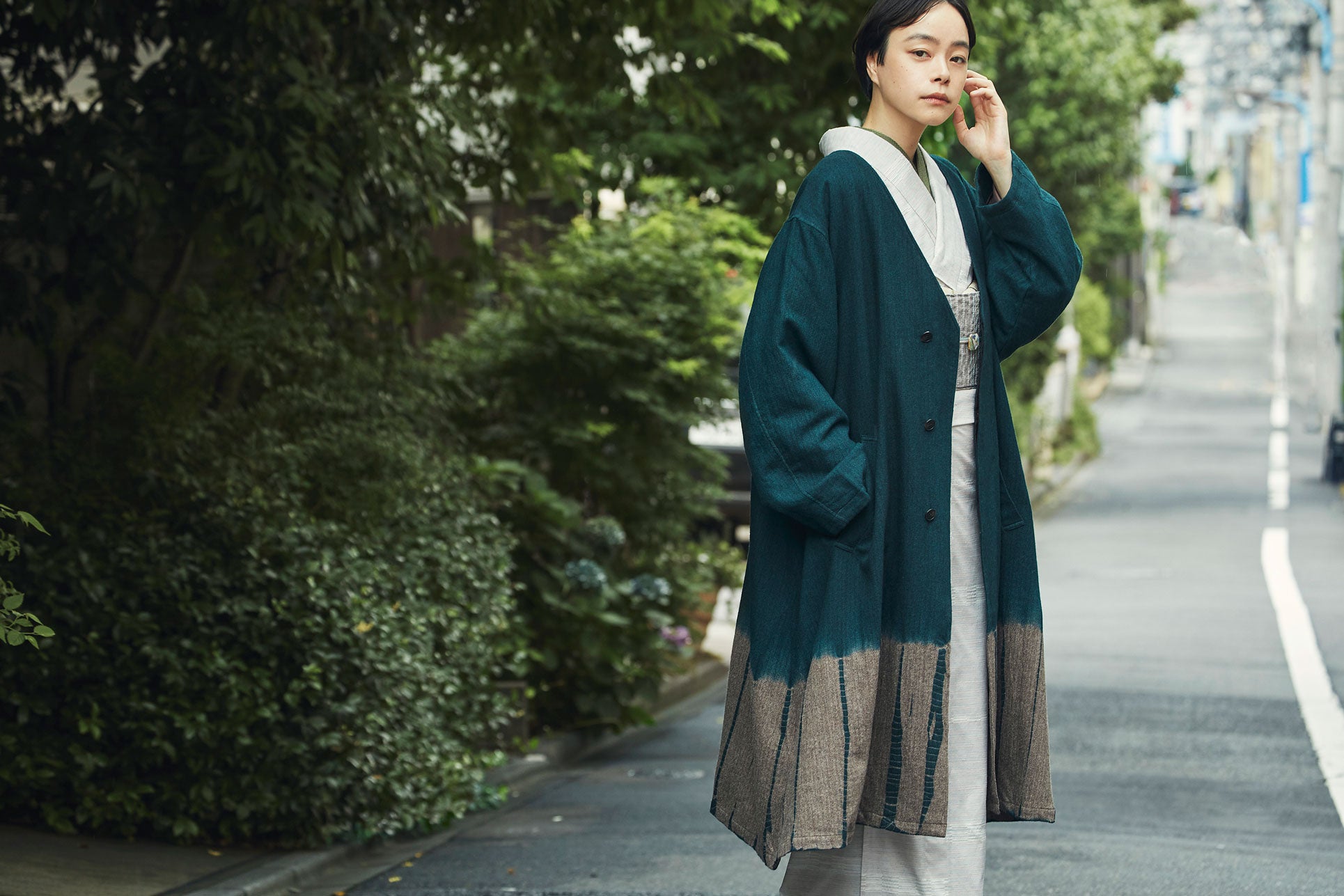 裾部分には<帽子染め分け絞り>が手しごとで施されており、絞り特有の滲んだ染め分け部分が、機械では生み出せない趣のある表情を醸し出します。大きめな衿は着姿のポイントとなり、洋服でもきものでもお使いいただけるコートとなっています。