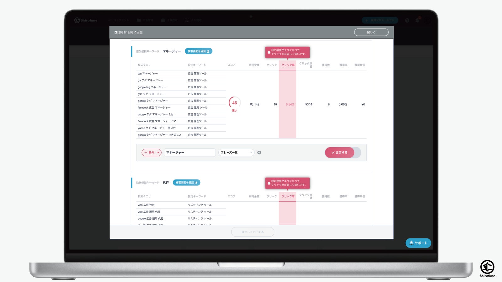 通常の運用では、運用者が管理ページの数値と自身の知見・経験から、キーワードの追加・除外、検索クエリの除外設定を手動で行っていますが、Shirofuneではアルゴリズムがその最適な設定環境を分析し、チェックの必要なキーワードを自動でリストアップし、改善カードとして管理画面に表示。利用者はその改善カードを見て、追加・除外のYES or NOを答えるだけで、日々最適な環境が設定されます。