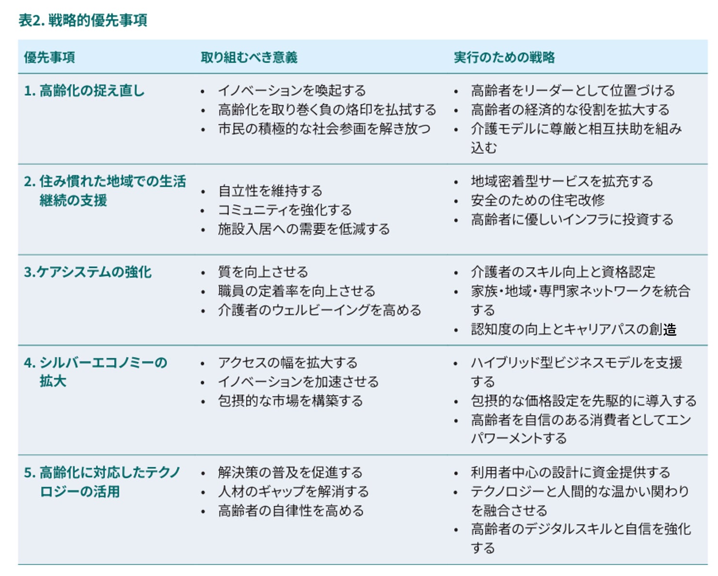 高齢化の捉え直し:高齢化を負担ではなく、高齢者のリーダーシップと経済的役割を解き放つ機会として捉える。