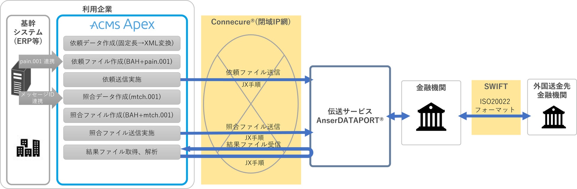 最新版のACMS Apexでは、「ISO20022対応外国送金」オプションとして、ISO20022に準拠したフォーマットでの依頼ファイル・照合ファイルの作成、結果ファイルの解析を行う機能を提供し、それらを「AnserDATAPORT® 外国送金のISO20022対応」接続で必要なJX手順で送受信することを可能としました。また、外国送金のファイル送受信に関わる各種フローやサンプルジョブ等を提供することで環境構築も容易にしました。さらに外国送金の進捗状況を画面上から確認することが可能で、万が一のエラーや障害発生時の迅速な状況把握も容易にしました。
