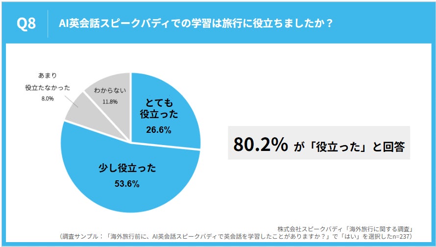 ・「AI英会話スピークバディ」での学習が「旅行に役立った」が8割以上