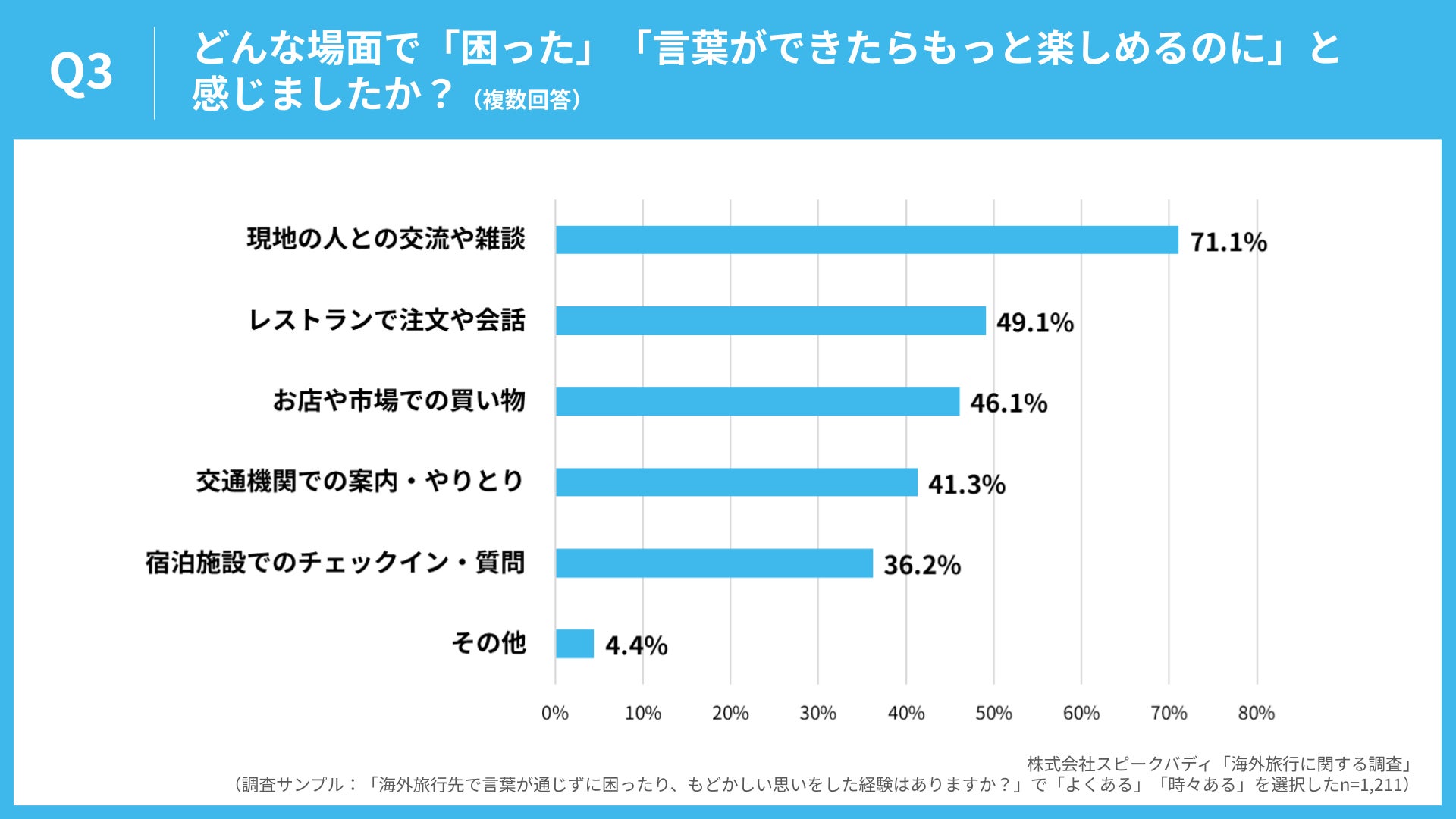 言葉が通じないために困ったり、もどかしい思いをした場面については、「現地の人との交流や雑談」(71.1%)が、次点の「レストランでの注文や会話」(41.3%)を30ポイント近く上回りました。