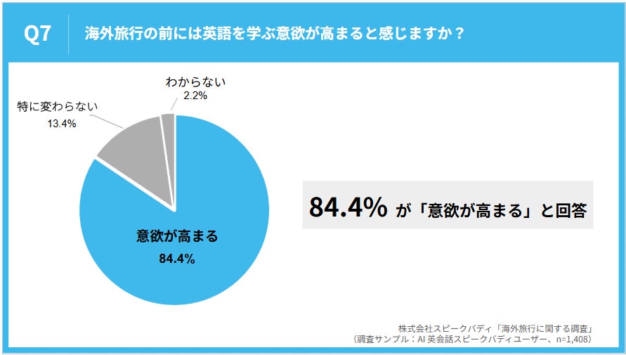 「海外旅行の前には英語を学ぶ意欲が高まると感じますか?」の問いには、84.4%が「意欲が高まる」と回答しました。