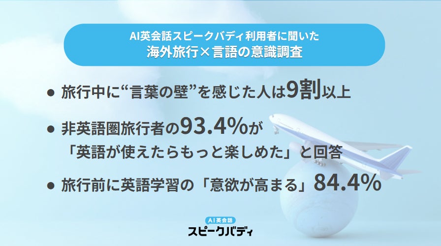 株式会社スピークバディ(本社:東京都中央区、代表取締役CEO:立石剛史、以下「当社」)は、夏休みの海外旅行シーズンに向け、当社が開発・運営する「AI英会話スピークバディ」ユーザー1,408名を対象に「海外旅行に関する調査」(以下「本調査」)を実施しました。