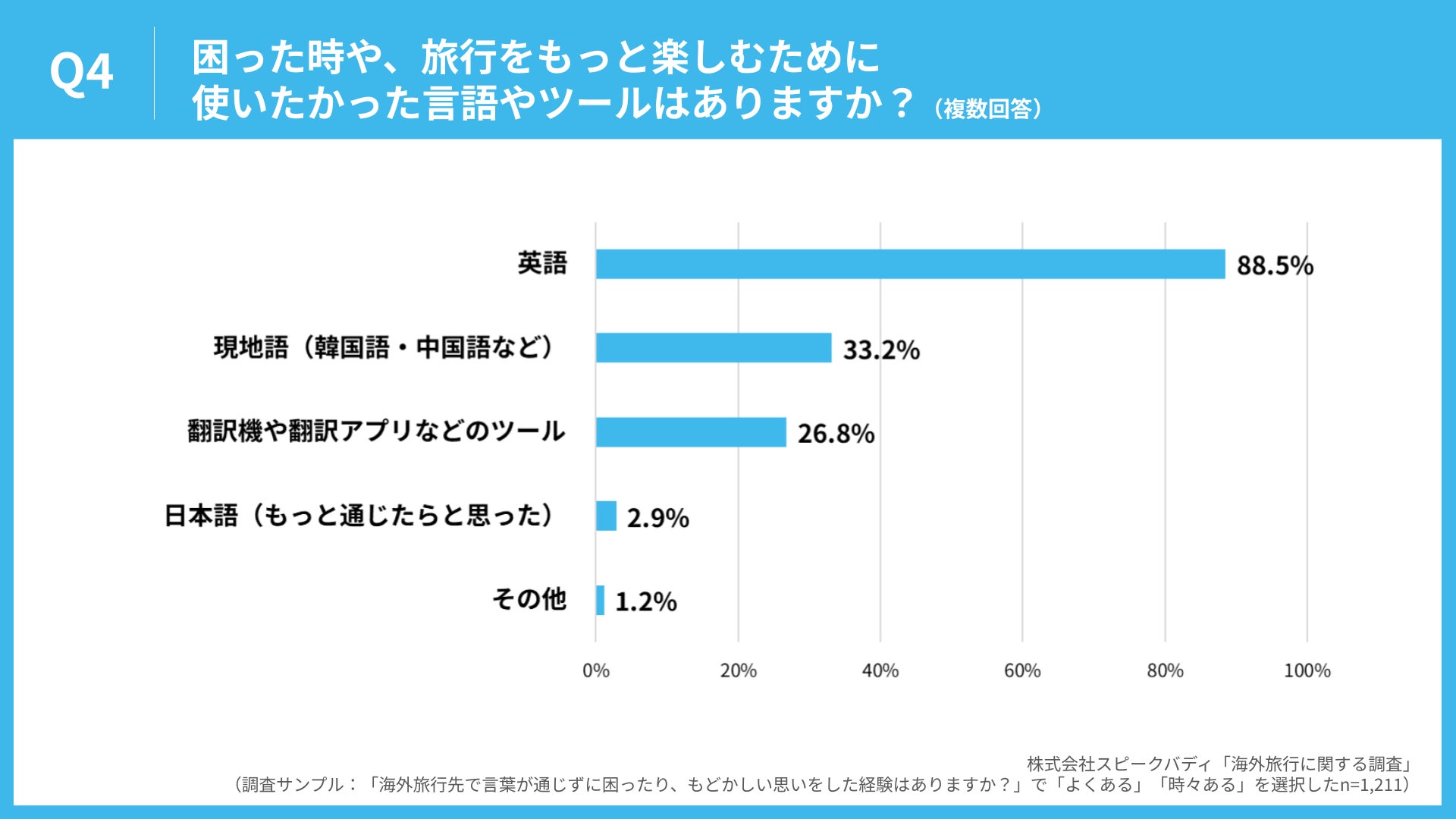 88.5%が「楽しむためには現地語や翻訳機よりも英語が有効」と回答、最も困ったのは「雑談や交流」