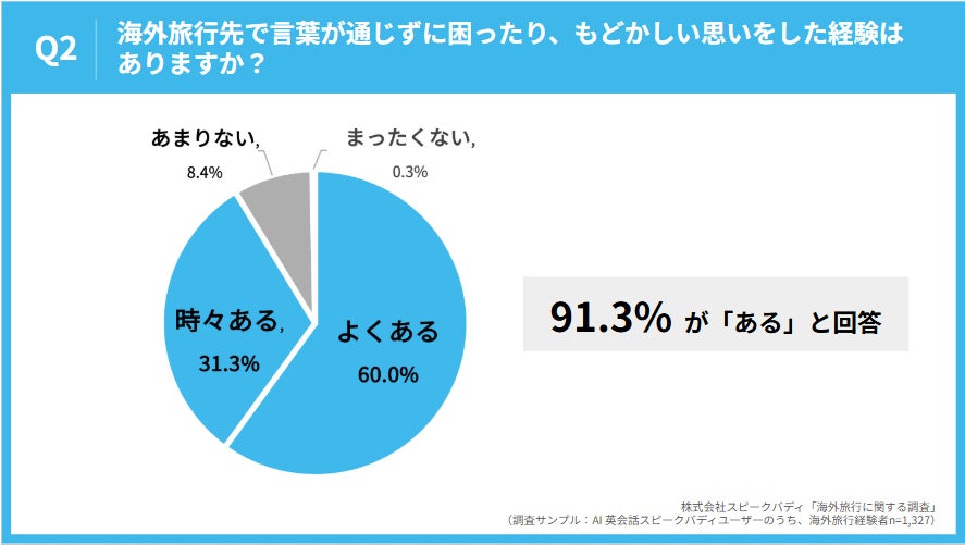 海外旅行経験者を対象に「海外旅行先で言葉が通じずに困ったり、もどかしい思いをした経験はありますか?」と尋ねたところ、「よくある」「時々ある」が合わせて91.3%に達しました。