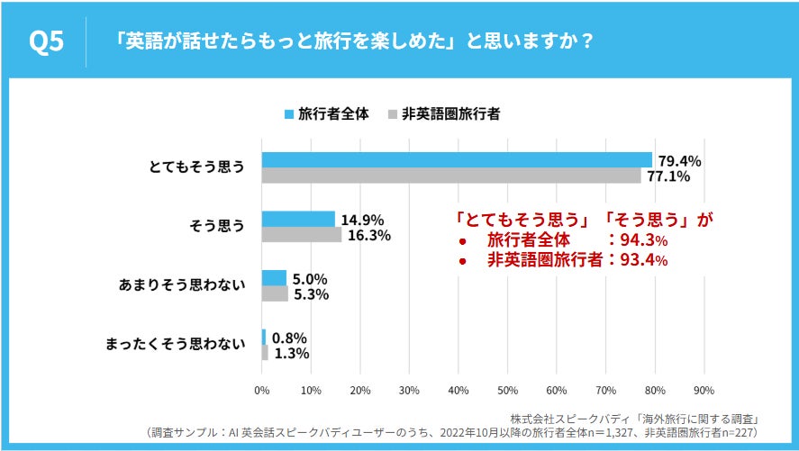 さらに、「英語を話せたらもっと旅行を楽しめたと思いますか?」に対しては、「とてもそう思う」「そう思う」が旅行者全体では94.3%、非英語圏旅行者においても93.4%となりました。日本では第一外国語として英語を学ぶことが一般的であることから、英語が共通語として役割を果たす場面は多く、旅行の充実度を左右していると考えられます。