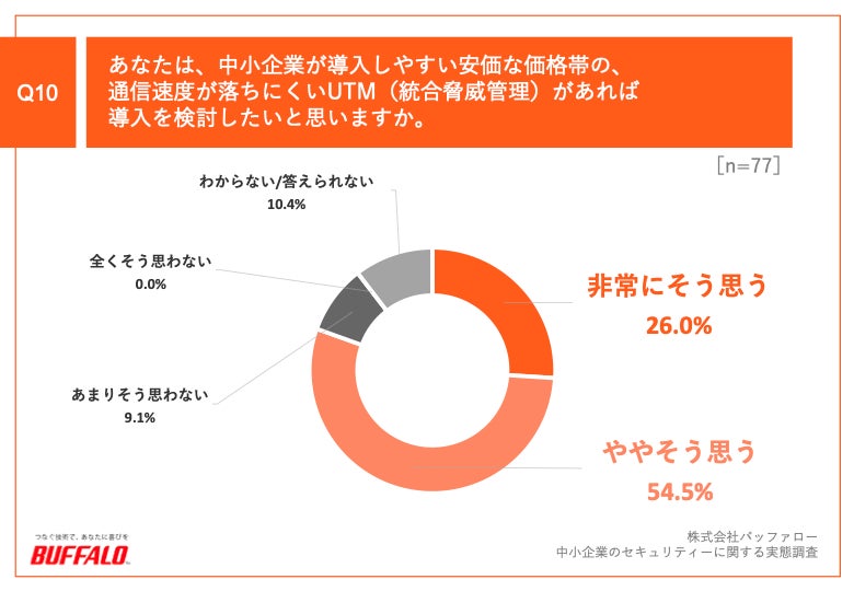 Q8で「非常にそう思う」「ややそう思う」と回答した方に、「Q10.あなたは、中小企業が導入しやすい安価な価格帯の、通信速度が落ちにくいUTM(統合脅威管理)があれば導入を検討したいと思いますか。」(n=77)と質問したところ、「非常にそう思う」が26.0%、「ややそう思う」が54.5%という回答となりました。