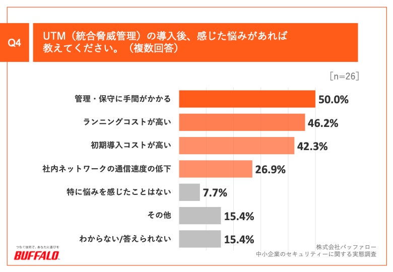 Q1で「UTM(統合脅威管理)」と回答した方に、「Q4.UTM(統合脅威管理)の導入後、感じた悩みがあれば教えてください。(複数回答)」(n=26)と質問したところ、「管理・保守に手間がかかる」が50.0%、「ランニングコストが高い」が46.2%、「初期導入コストが高い」が42.3%、「社内ネットワークの通信速度の低下」が26.9% という回答となりました。