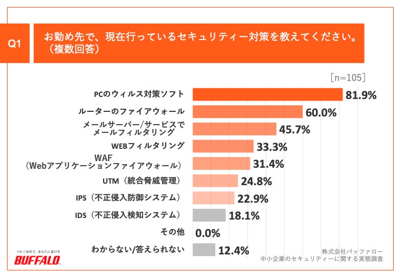 メルコホールディングス(東・名 6676)グループの株式会社バッファロー(本社:名古屋市、代表取締役社長:牧 寛之、以下バッファロー)は、中小企業(従業員数10名〜300名未満)の情報システム担当者105名を対象に、中小企業のセキュリティーに関する実態調査を実施しましたので、お知らせいたします。