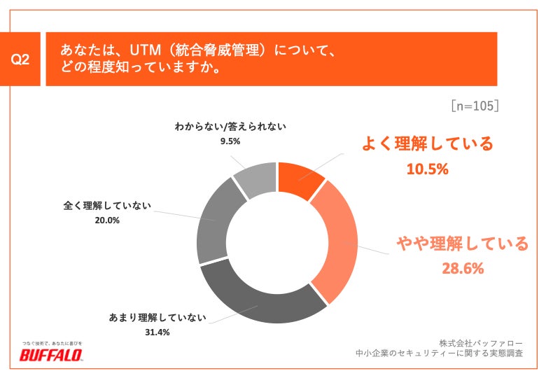 「Q2.あなたは、UTM(統合脅威管理)について、どの程度知っていますか。」(n=105)と質問したところ、「あまり理解していない」が31.4%、「全く理解していない」が20.0%という回答となりました。